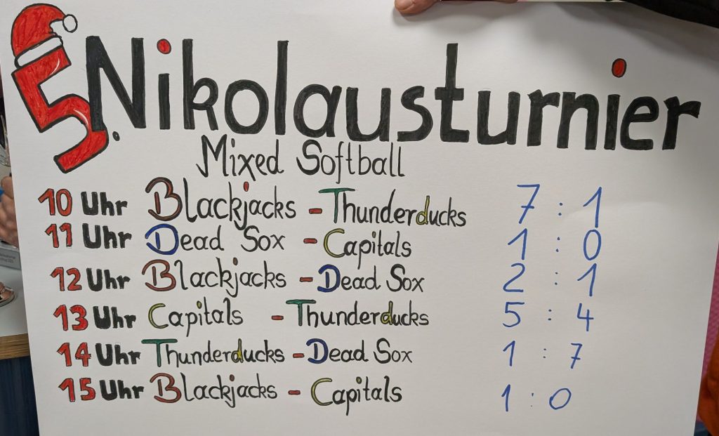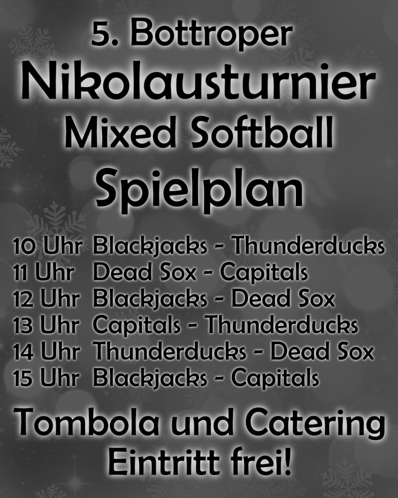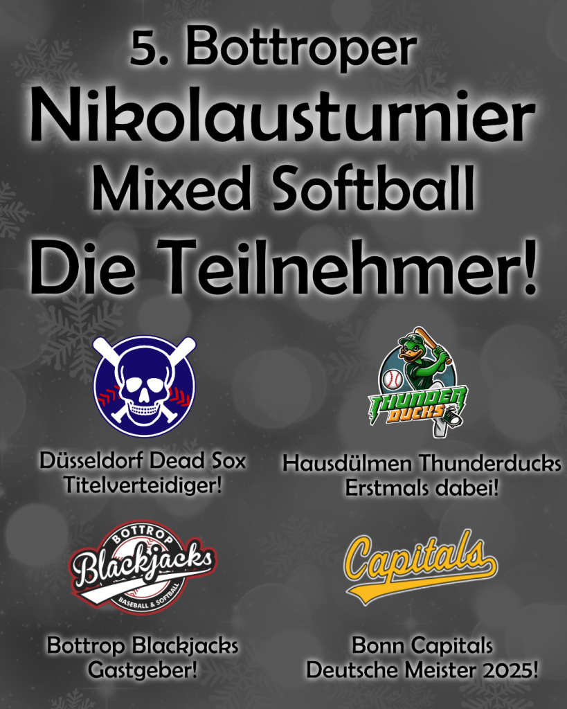 Am 30. November 2025 fand zum fünften Mal das Nikolausturnier in Bottrop statt. Vier Teams aus dem Mixed-Softball-Bereich sind am Start. Neben uns Blackjacks als Ausrichter waren in diesem die Hausdülmen Thunderducks, die Düsseldorf Dead Sox und die Bonn Capitals dabei.