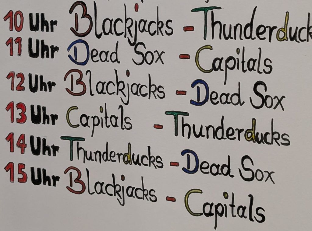 Mit den Thunderducks ist ein erst vor kurzem (neu) gegründeter Softball-Verein am Start, der uns die gesamte Saison über begleitet hat und der in diesem Jahr das Finalturnier der BBQ-Liga ausgerichtet hat. Die Dead Sox waren als Titelverteider am Start. Mit uns sind die Düsseldorfer bisher auch an jedem Nikolausturnier am Start gewesen. Bei den Bonn Capitals haben wir uns über die Zusage sehr gefreut, schließlich sind sie dieses Jahr (zum 2x nach 2022) Deutsche Meister im Softball geworden! Das versprach auf jeden Fall ein Highlight-Spiel für die weiteren Teams zu werden!